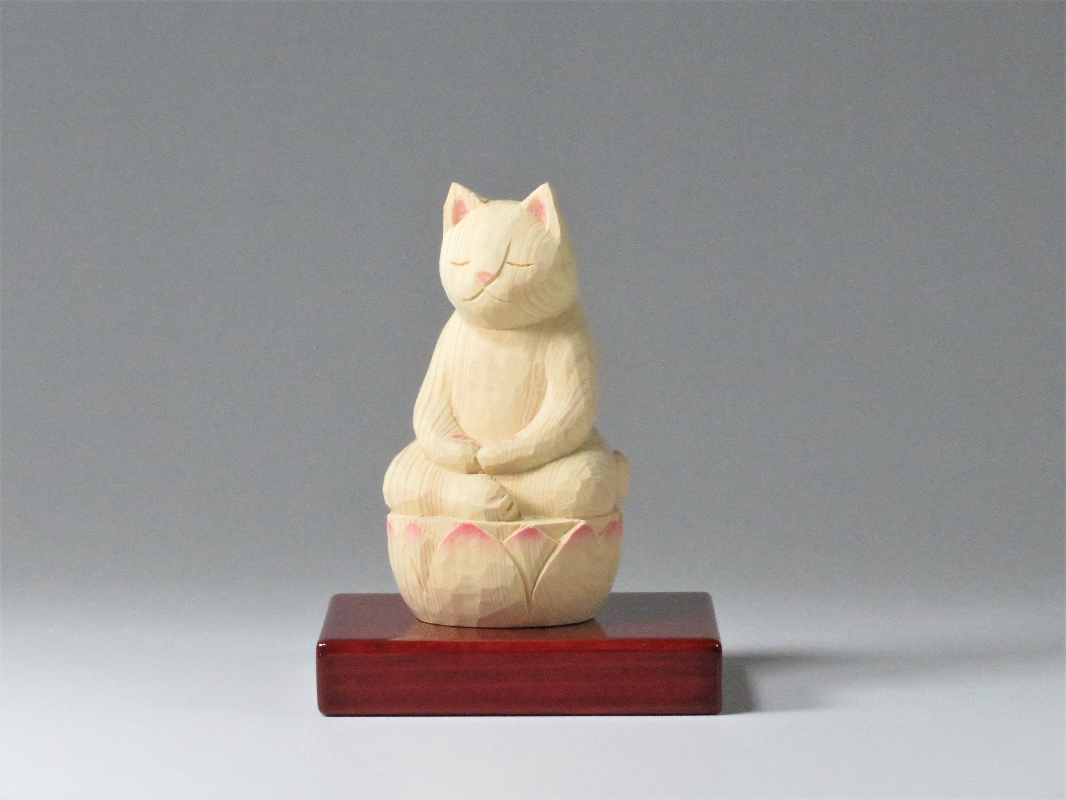 静かに目を閉じ、穏やかな表情で蓮華座に座る猫さんです。